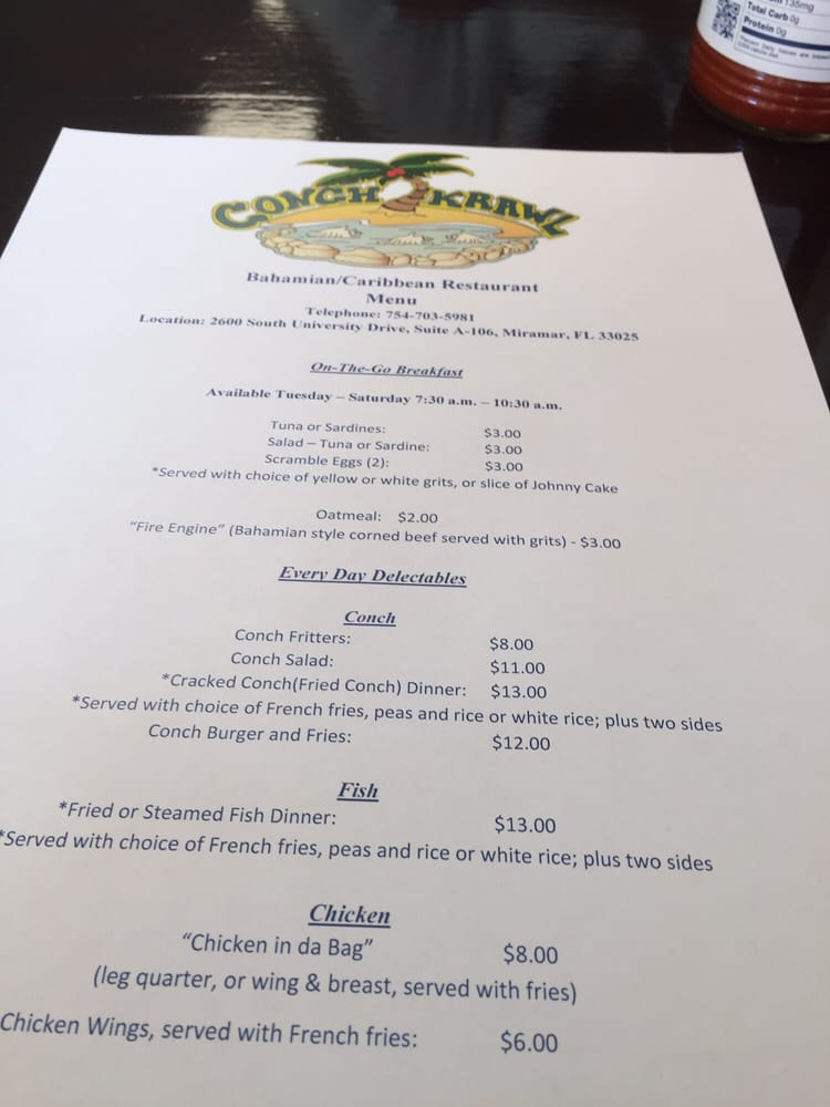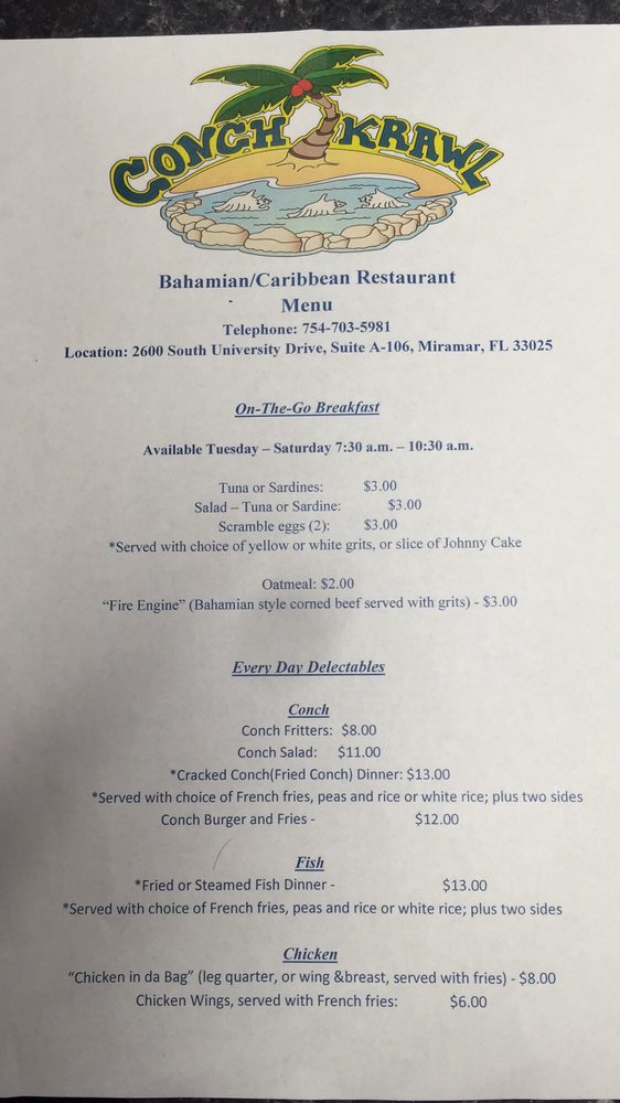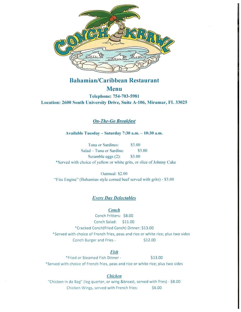 Conch Krawl, a Caribbean seafood restaurant located in Miramar, FL, offers a unique dining experience with its freshly made and flavorful dishes. Customers rave about the Bahamian vibes and well-seasoned conch dinner, plantains, and vegetable rice. The restaurant provides a classy atmosphere and is suitable for groups and kids. Conch Krawl also offers takeout, reservations, and delivery services, making it convenient for all diners. The attentive customer service and the dedication to preparing food to order ensure a great dining experience. With positive reviews highlighting the delicious flavors and quality ingredients, Conch Krawl is a must-try for seafood lovers seeking authentic Caribbean cuisine.